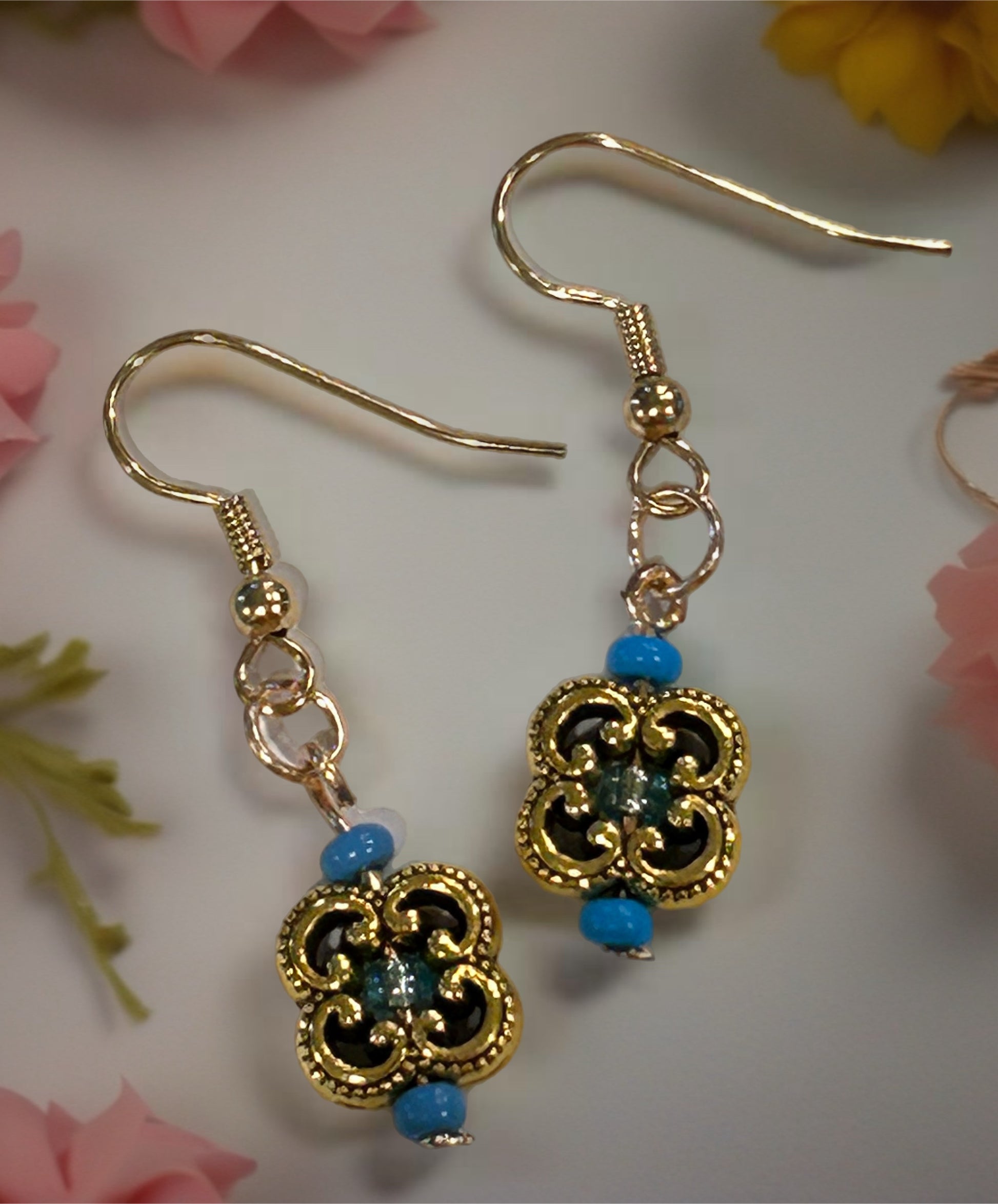 Clover Filigree Earrings With Turquoise Blue Glass Accent Beads - Gold Tone