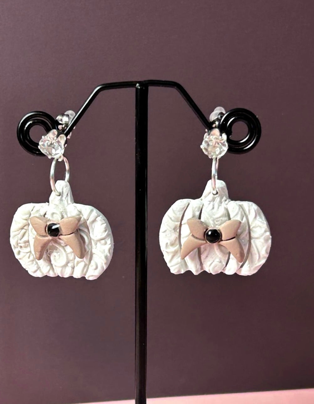 Add a sophisticated seasonal touch with these white textured pumpkin earrings, adorned with a patterned bow and sparkling crystal stud. Available in your choice of gold tone or silver tone hardware, each pair is handmade for a truly unique accessory.