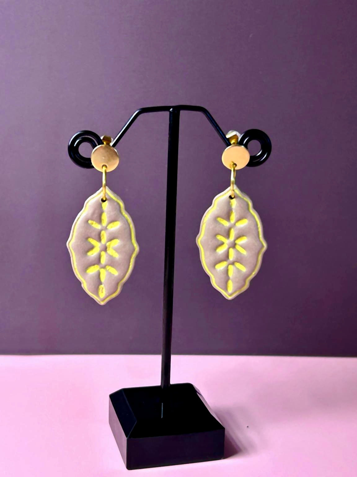 These earthy taupe leaf-shaped earrings feature intricate pale yellow inlay detailing, paired with sleek gold-tone stud tops for a warm autumn glow. A perfect accessory to complement cozy fall outfits.