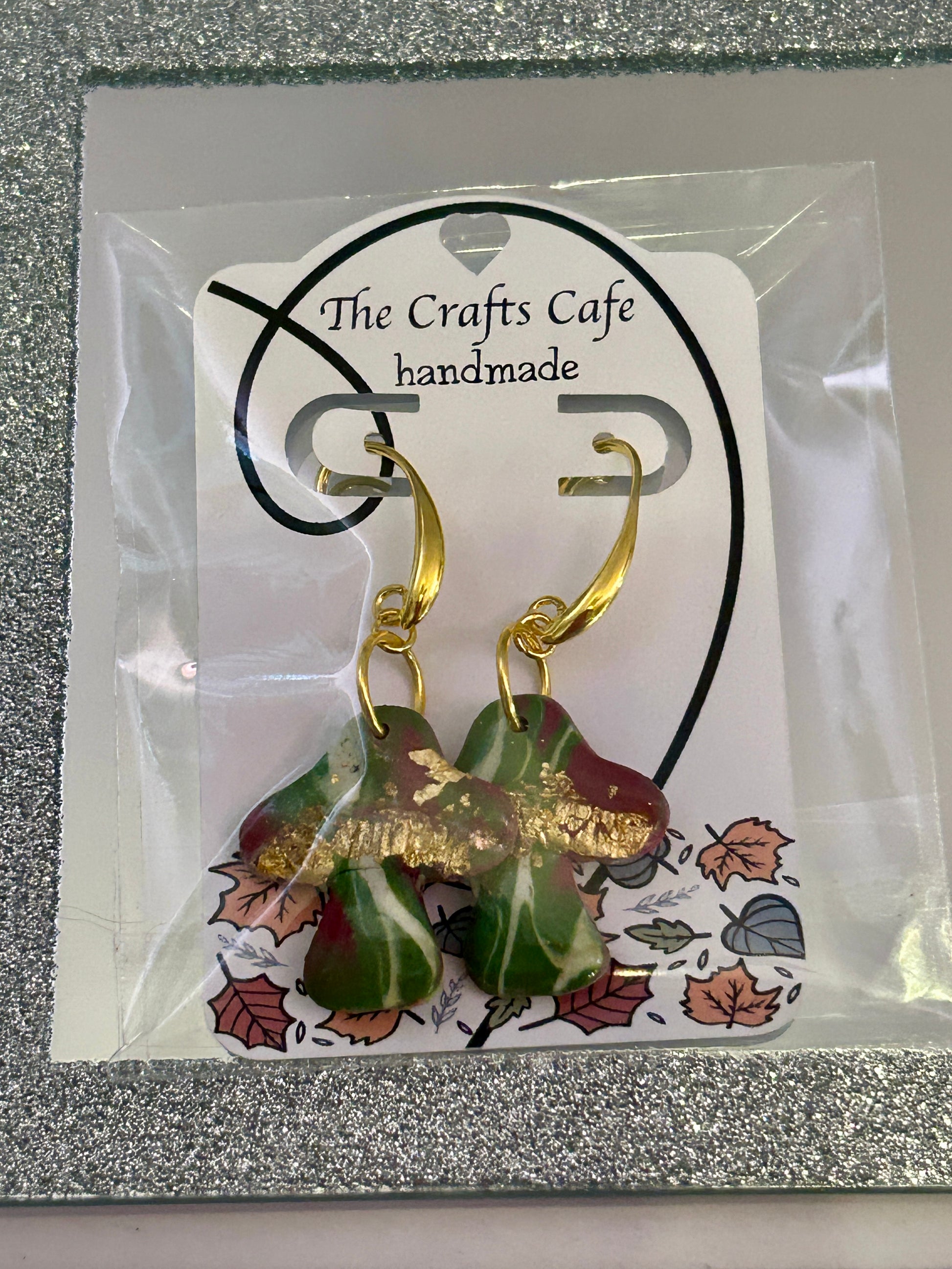 Handmade polymer clay mushroom earrings crafted with a marbling technique, making each pair one-of-a-kind. Moss green and burgundy marbled with white. Accented with gold foil flecks and finished with gold hooks. Lightweight, durable, and perfect for everyday wear or as a gift for any mushroom lover.